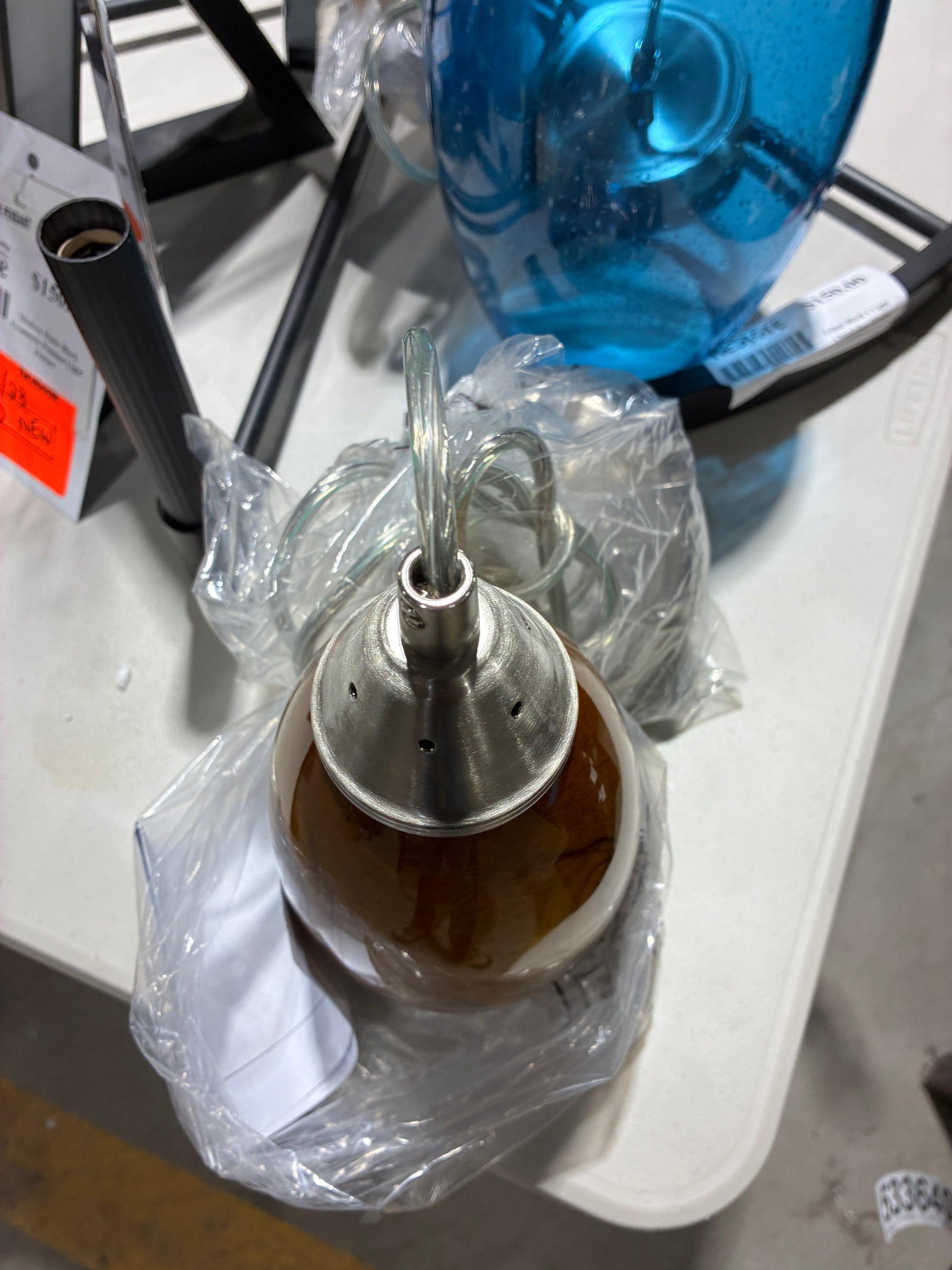 This stylish pendant light features a rich amber art glass shade with subtle swirling detail, paired with brushed nickel hardware for a warm yet modern look. The glass has a smooth, glossy finish and a softly rounded shape that works beautifully over a kitchen island, bar area, or as an accent light in a dining or living space.