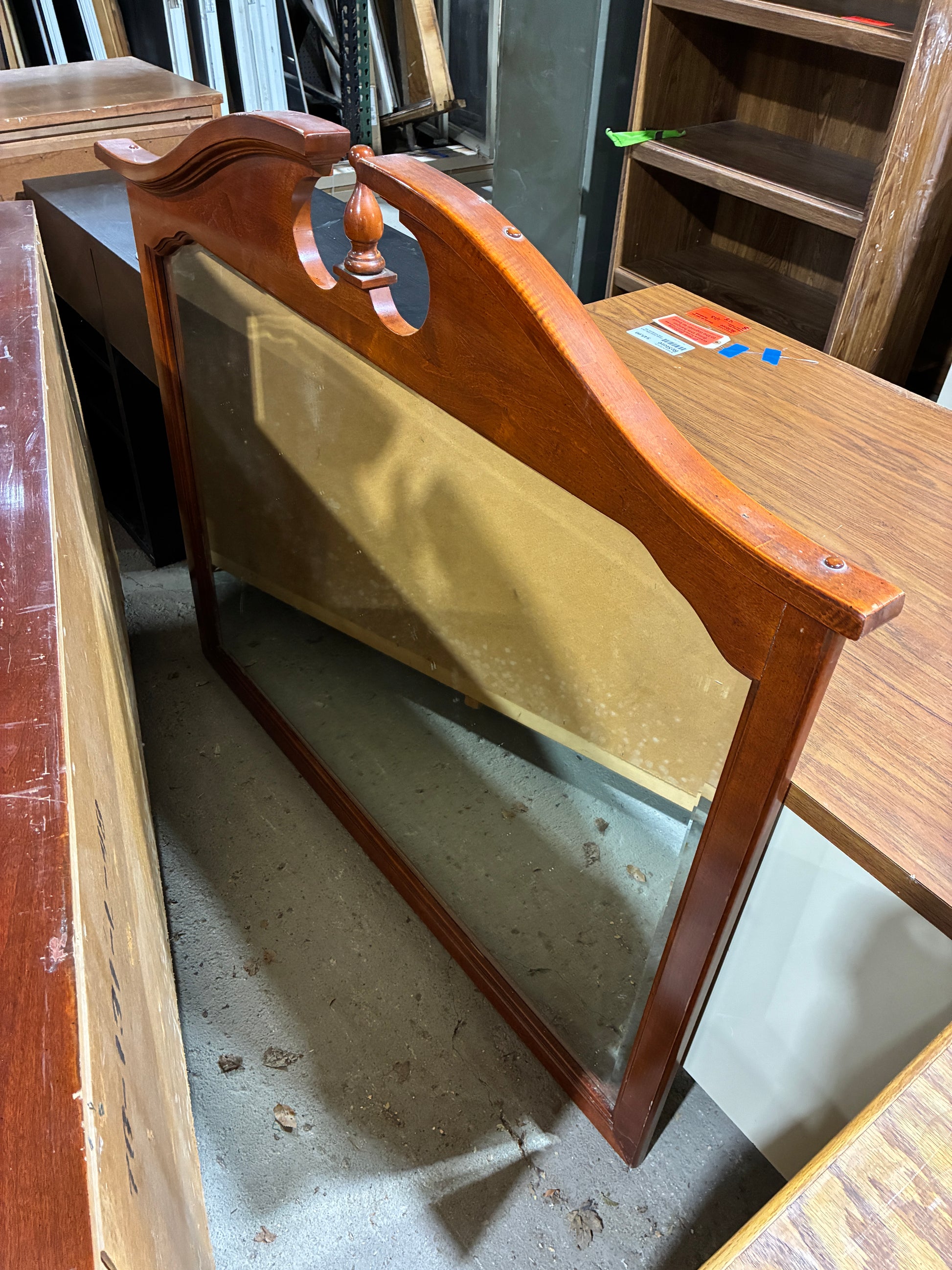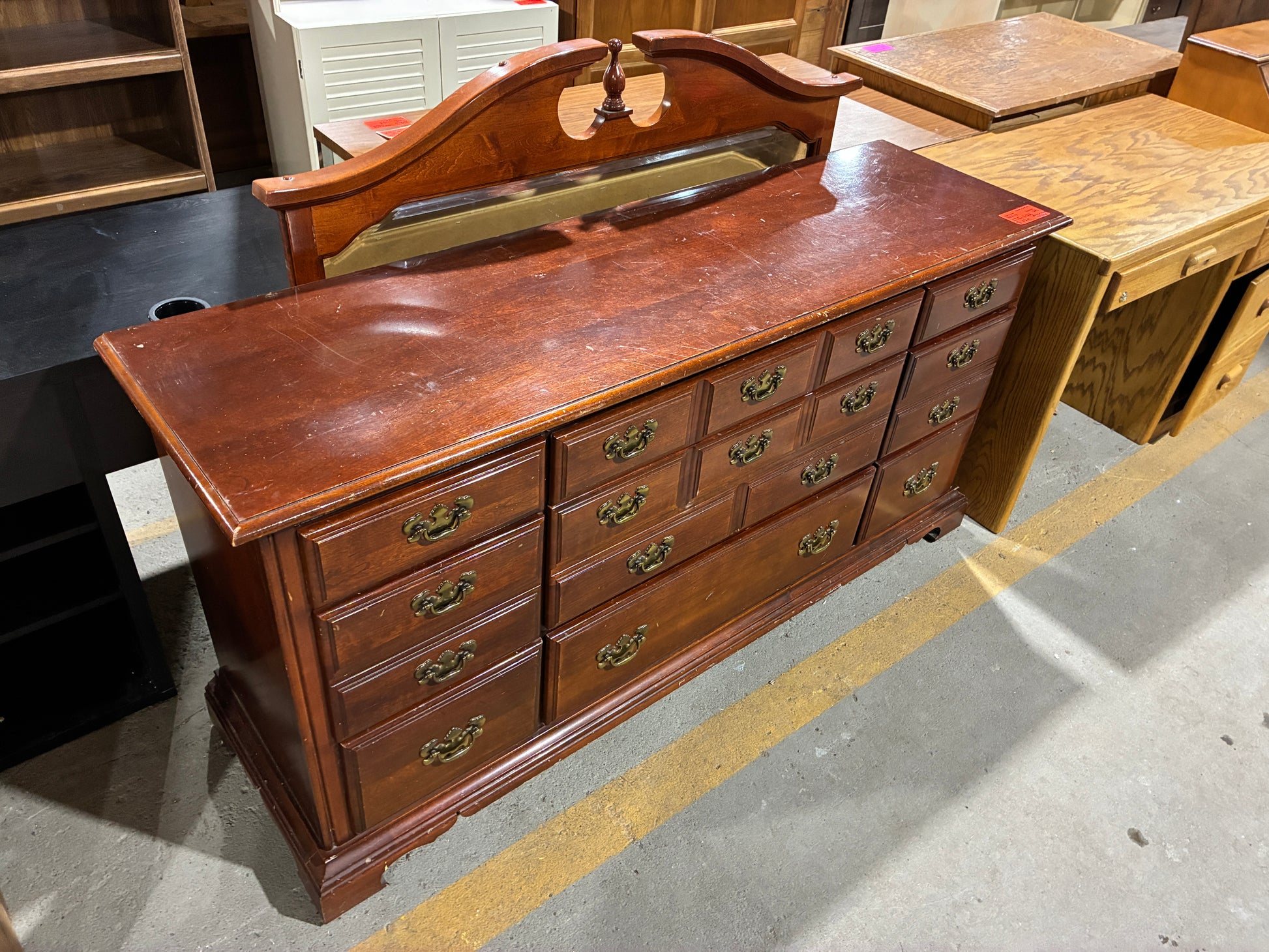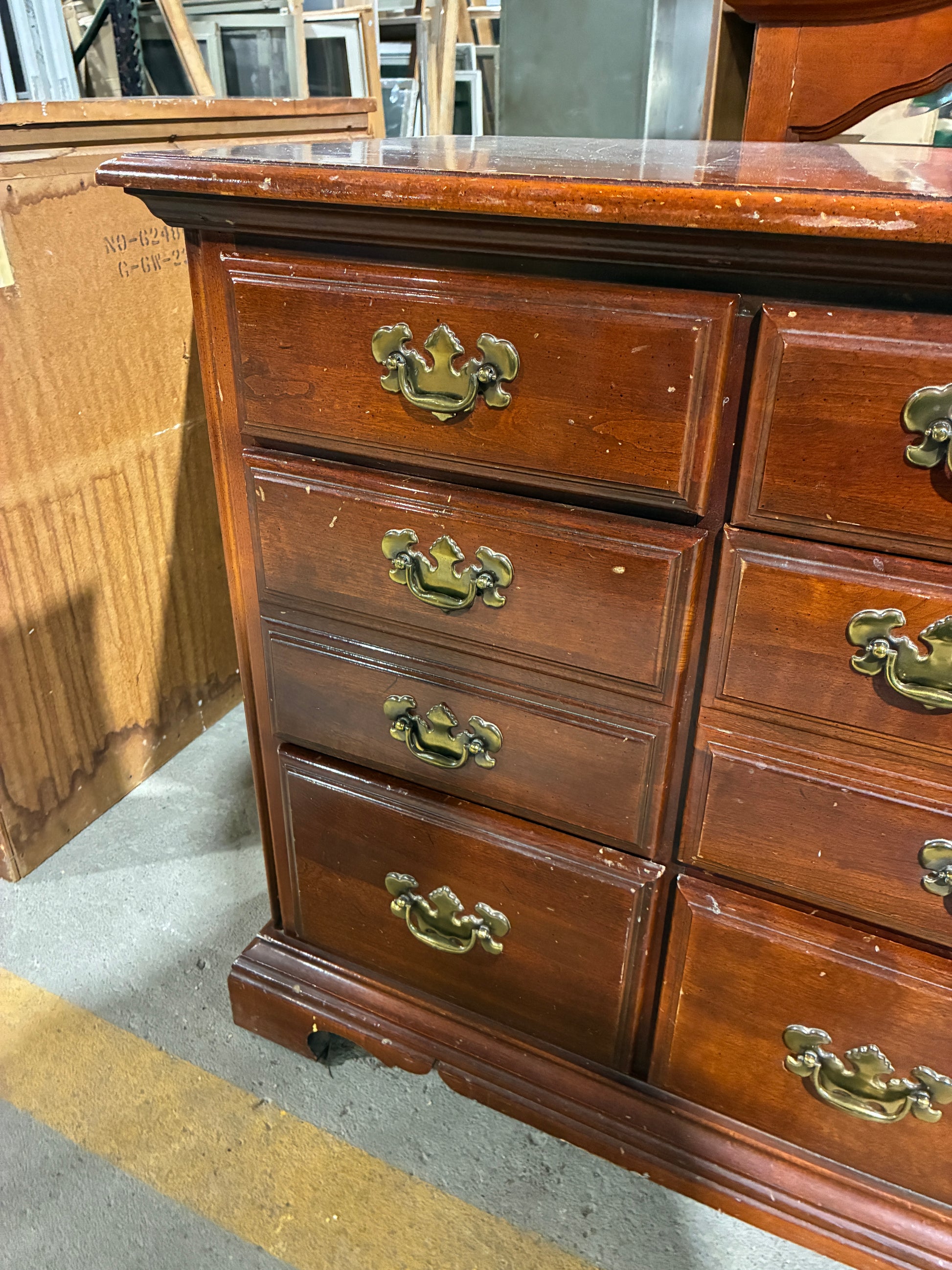 This solid wood dresser by American Drew features a rich medium brown finish, classic brass hardware, and generous storage with multiple drawers in a traditional layout. The piece includes a matching mirror with a decorative wood frame, making it a great option for a bedroom, guest room, or vintage inspired space.