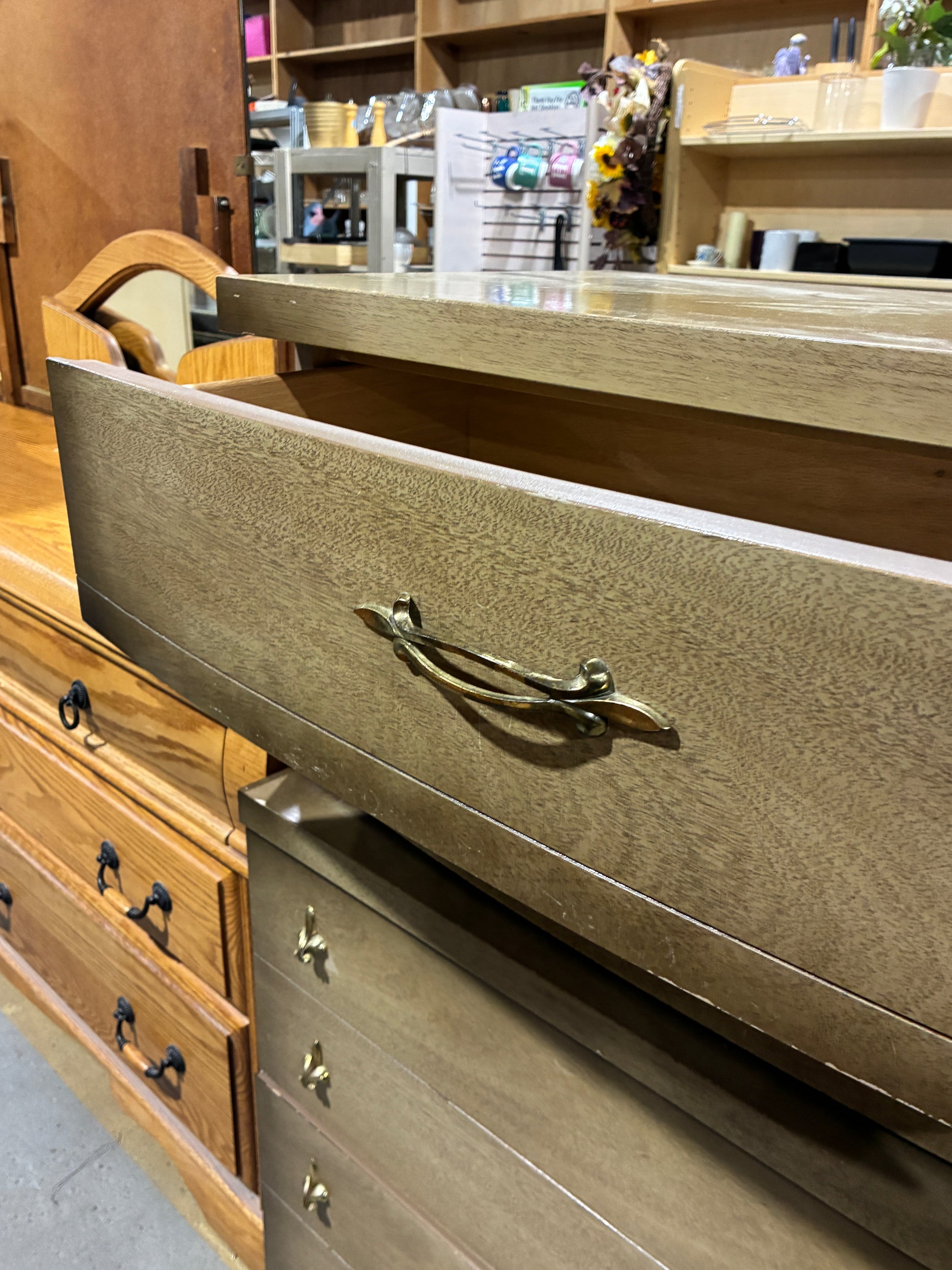This vintage Bassett Furniture chest of drawers offers timeless craftsmanship and practical storage in a compact design. Built from solid wood with classic brass hardware, it’s a sturdy and stylish piece that complements both traditional and mid-century interiors.