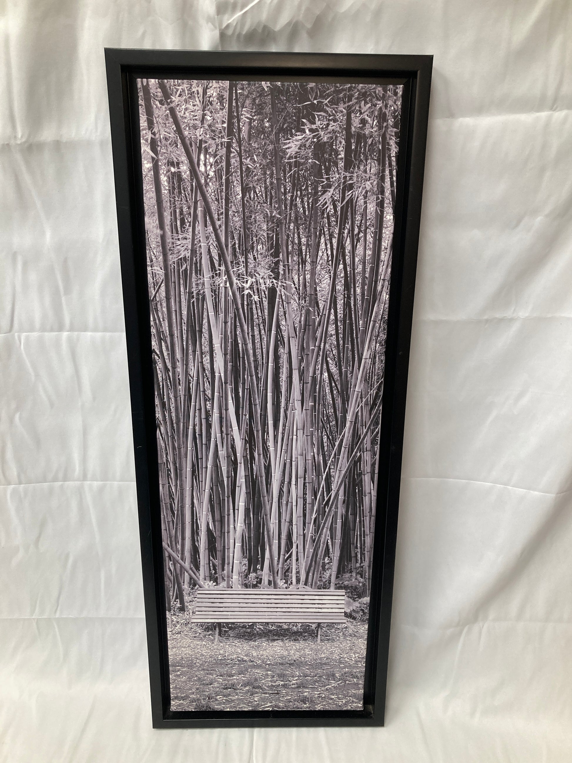 Add a touch of tranquility to your space with this striking black and white wall art. Featuring a serene bench set against a backdrop of tall bamboo stalks, the vertical composition draws the eye upward and creates a calming, natural aesthetic. The sleek black frame complements the monochrome tones, making it versatile for modern, minimalist, or nature-inspired décor.